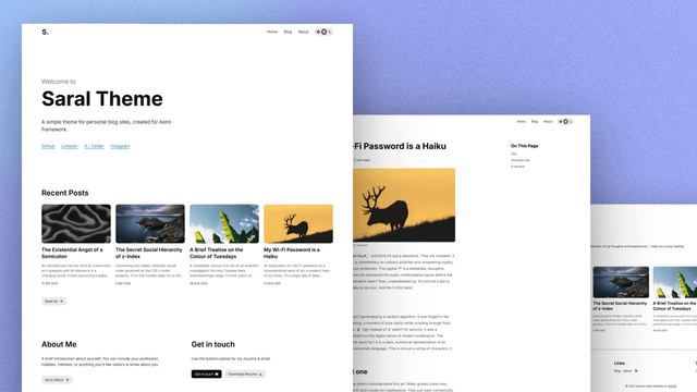 An Astro theme featuring multi-format content including knowledge cards, articles, slide presentations, and doodle announcements.
