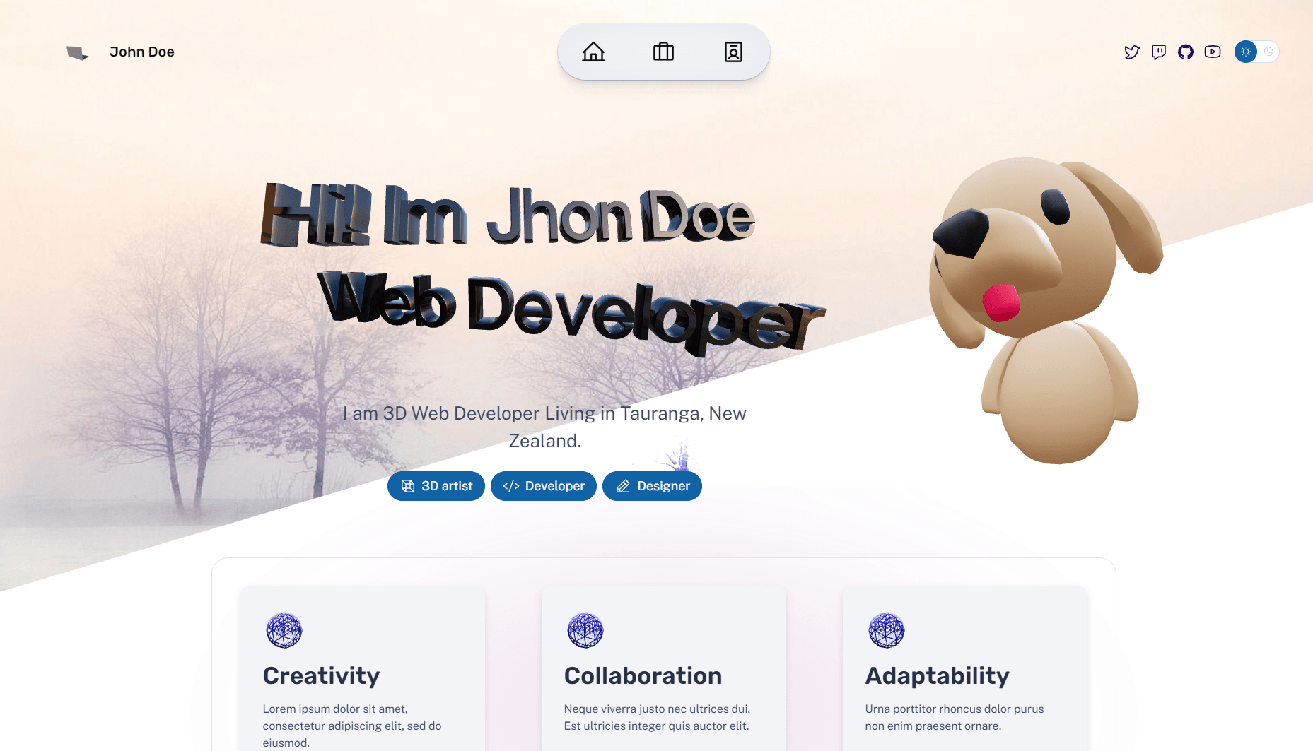 This template allows developers to feature their portfolios in a clean, modern design while also incorporating custom 3D elements, animations, and interactions. Whether you're highlighting your projects, skills, or experiences, the 3D components enhance the way you present yourself as a developer.