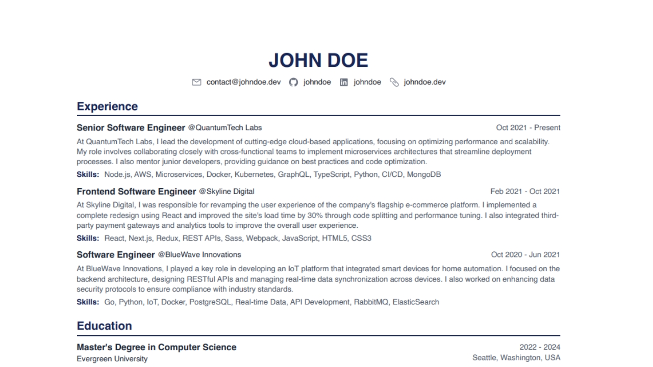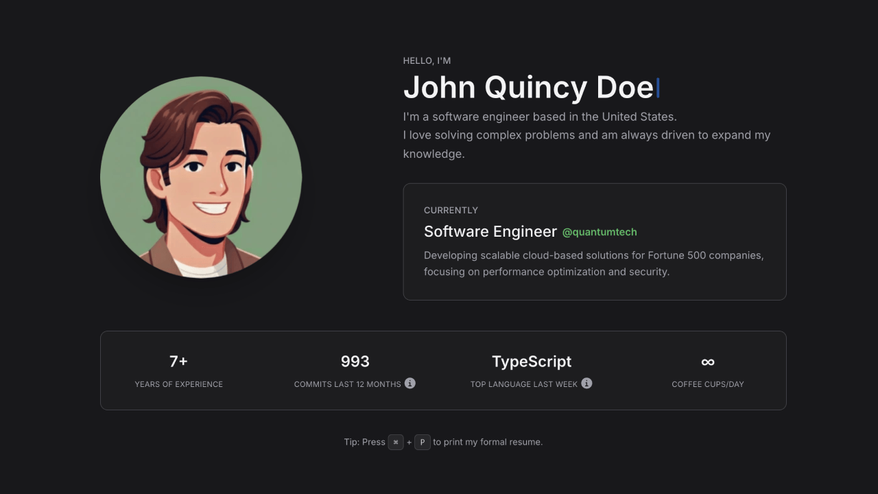 Automatically generates both web pages and formal resumes for printing based on JSON files, making data updates easy and fast.