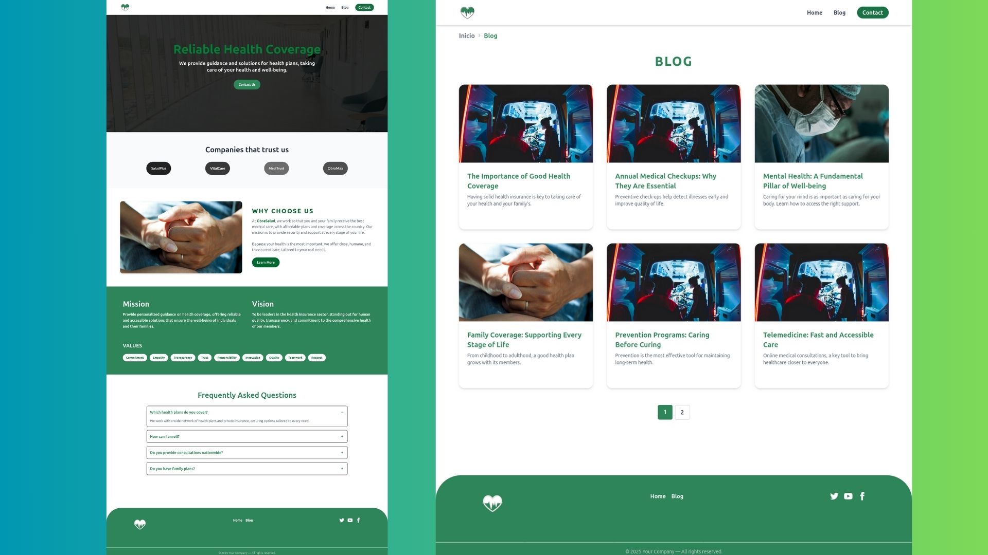 Website developed with Astro and Tailwind CSS, designed to showcase the services, benefits, and health programs of a health insurance provider.